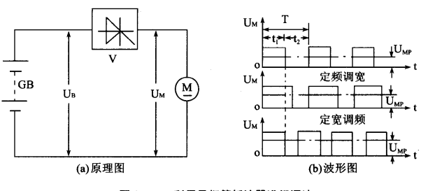 當(dāng)電動(dòng)叉車(chē)直流串勵(lì)電動(dòng)機(jī)晶閘管 V導(dǎo)通時(shí),其端電壓 Um 等于電源電壓 U;當(dāng)晶閘管 V關(guān)斷時(shí)電動(dòng)機(jī)與電源斷開(kāi),其端電壓 Um 等于零。如果使晶閘管按一定的速度周期性地導(dǎo)通和關(guān)斷,則電動(dòng)機(jī)的端電壓 Um 將有如圖2(b) 所示的波形假設(shè)晶閘管的導(dǎo)通時(shí)間 t(為導(dǎo)通時(shí)間寬度),關(guān)斷時(shí)間為(稱(chēng)為關(guān)斷時(shí)間寬度),則電動(dòng)機(jī)端電壓的平均值 Um為: