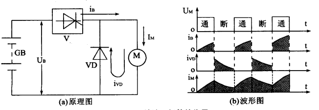 上述定頻調(diào)寬及調(diào)頻調(diào)寬的調(diào)速方法,在以后的蓄電池叉車(chē)電路中都有應(yīng)用。在實(shí)際應(yīng)用電路中,還在電動(dòng)機(jī)的兩端并聯(lián)一個(gè)二極管 VD,稱(chēng)作續(xù)流二極管,如圖2所示。